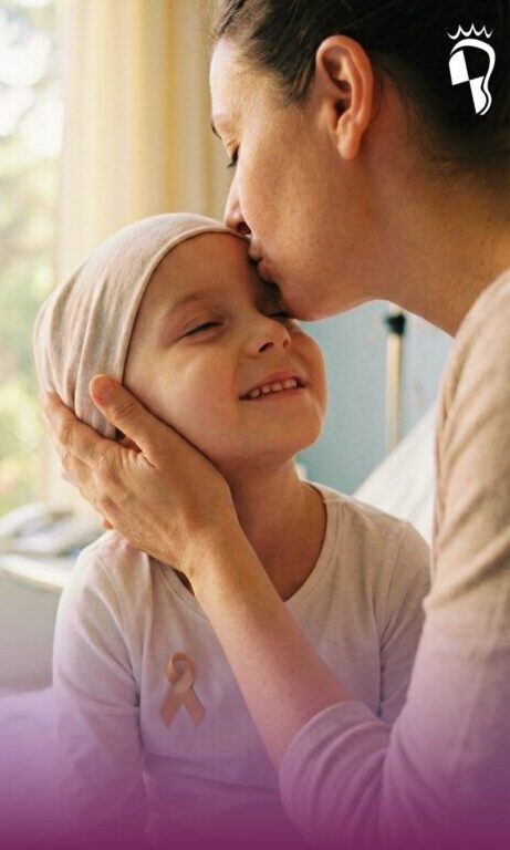 La recomendación de los expertos (CODEPEH):Primer plano vertical de una madre besando tiernamente la frente de un niño pequeño que sonríe con los ojos cerrados. El niño lleva un pañuelo oncológico en la cabeza y un lazo dorado en la camiseta. En la esquina superior derecha aparece el logo blanco de FAPAS CyL.